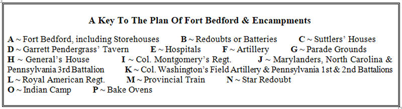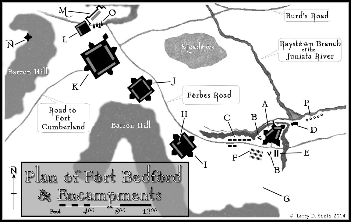 Colonel Henry Bouquet wrote to General John Forbes on 28 June 1758: Sir, I arrived here the 24th with the Pennsylvania regiment and the detachment of Virginia troops. . . The road beyond Juniatta is very good, and all the woods are full of excellent forage. Since my arrival I have been almost constantly on horseback, searching with Captain Gordon for a terrain suitable for the proposed plan. We have searched without avail, and have found only high ground without water, or water in low and vulnerable places. Of the two inconveniences we finally chose the least and decided on the location which seemed least objectionable. The fort intended to contain our stores will be on a height, and will have a communication with a water supply which cannot be cut off. Work was begun this morning, and will be pushed with all possible dispatch. From the very start I encountered a difficulty which I had foreseen, in that the Virginia troops do not wish to work without being paid. The Pennsylvanians have all offered voluntarily to work for a gill of rum a day. While awaiting your orders, I shall have the former mount guard, and employ the latter on the works.
