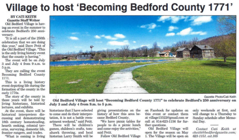 Below is an article that appeared in the Bedford Gazette for Tuesday, 30 March 2021. Staff writer, Cati Keith provides information on the Becoming Bedford County 1771 event to be held at Old Bedford Village on the 3rd and 4th of July, 2021.