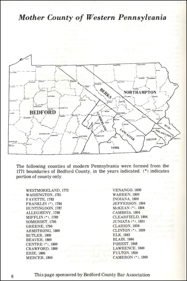 The argument was proposed by the honorable William P. Schell in 1907 ~ that all of the western Pennsylvania counties were part of, and erected out of, Bedford County. He presented his argument in his small volume The Annals Of Bedford County.