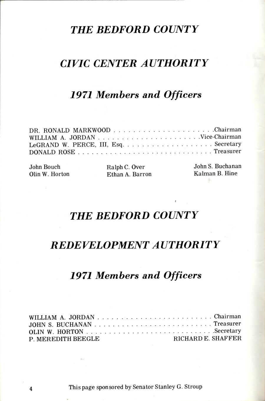 of the Bedford County Bicentennial was a list of the members and officers of the Civic Center Authority and the members and officers of the Redevelopment Authority.