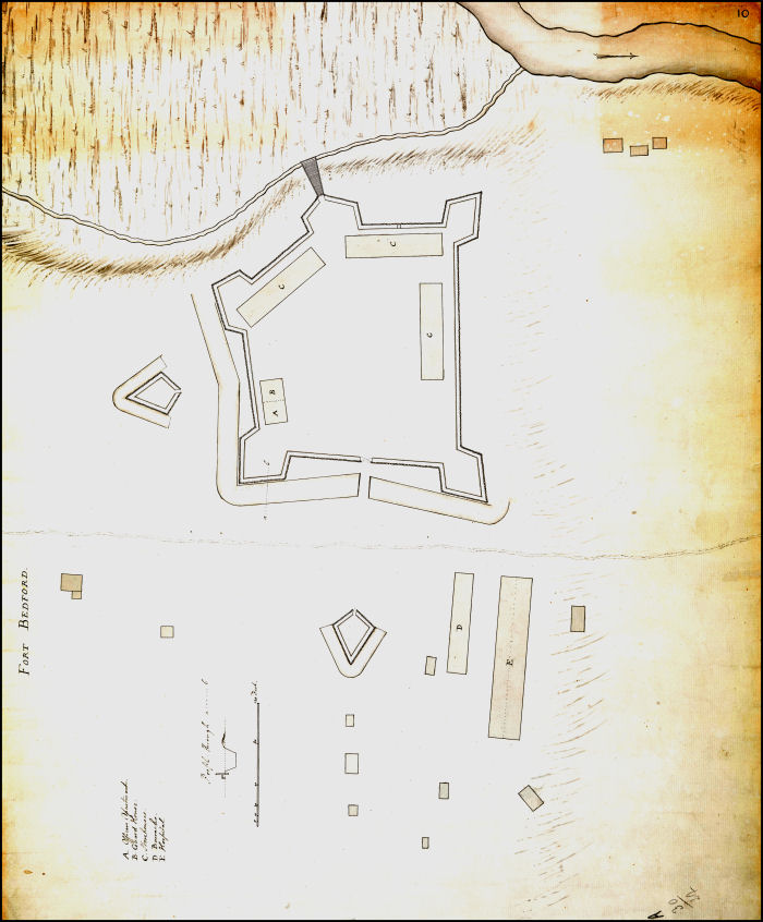 The plan shown below is based on the 1758 plan of Fort Bedford by J.C. Pleydell. It shows the layout of the redoubts to the west of the stockade fort.